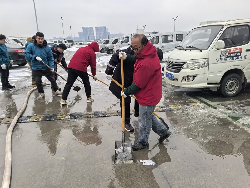 瑞雪兆丰年,祥瑞盈门,2026年第一场降雪在增添冬日景致的同时,也为市场运营带来了实际的考验。受1月20日凌晨降雪影响,朝阳粮油市场停车楼五楼平台积雪明显,车辆转弯处因冰雪覆盖易引发打滑隐患,影响了停车区域的正常通行与安全。 为及时消除安全隐患,保障市场交通畅通有序,1月20日中午12时许,市场迅速组织现场管理组、冷库组及后勤保障组员工,联合开展紧急铲雪除冰作业。工作人员不畏严寒,利用铁锹、扫帚等工具,重点对坡道、转弯区域及通行要道的积冰积雪进行集中清理。 经过近两小时的持续工作,至下午3时许,停车楼五楼主要通行区域的冰雪已被基本清除,道路恢复安全畅通。此次高效协同的应急处置,有效预防了可能发生的安全事故,展现了市场各部门团结协作、积极保障运营安全的良好风貌。